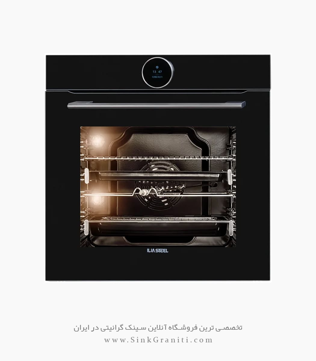 فر برقی ایلیا استیل مدل IO119 با ابعاد 57*59*59 سانتیمتر – مجهز به جوجه گردان, منوی فارسی و انگلیسی، دارای گنجایش محفظه پخت 90 لیتری با امکان بخارپز کردن مواد غذایی, دارای سنسور حرارتی, دارای فن خنک کننده بدنه فر, درب شیشه ای 4 جداره جداشونده, ریل تلسکوپی, دو عدد لامپ, دیواره چربی زدا Easy To Clean, فن کانوکشن, قفل کودک, گریل, لولای آرام بند و آرام بازشو, مجهز به سنسور پخت غذا میباشد.